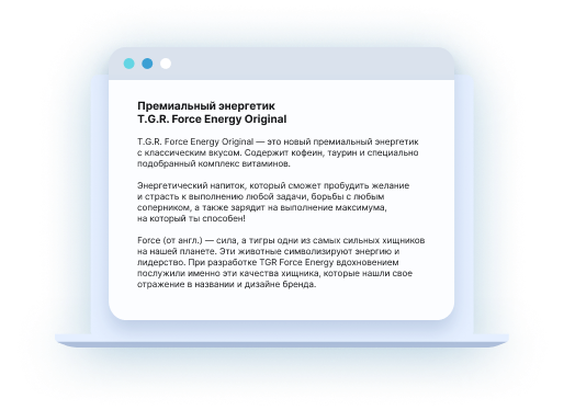 Рассказываем о продуктах наших клиентов простым и понятным языком, но с маркетинговой точки зрения — так, чтобы ответить на все возможные вопросы клиента, и помочь ему принять решение о покупке.